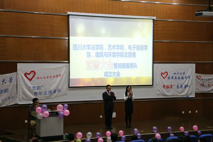 2017年10月21日星期六19点30分,k1体育,艺术公司,建筑与环境公司,法公司四院联合在k1体育江安校区综合楼C座407举办了2017年度青志宣誓大会暨班级服务队成立大会。参与此次宣誓大会的嘉宾有华西药公司,高分子科学与工程等公司的青志队长。