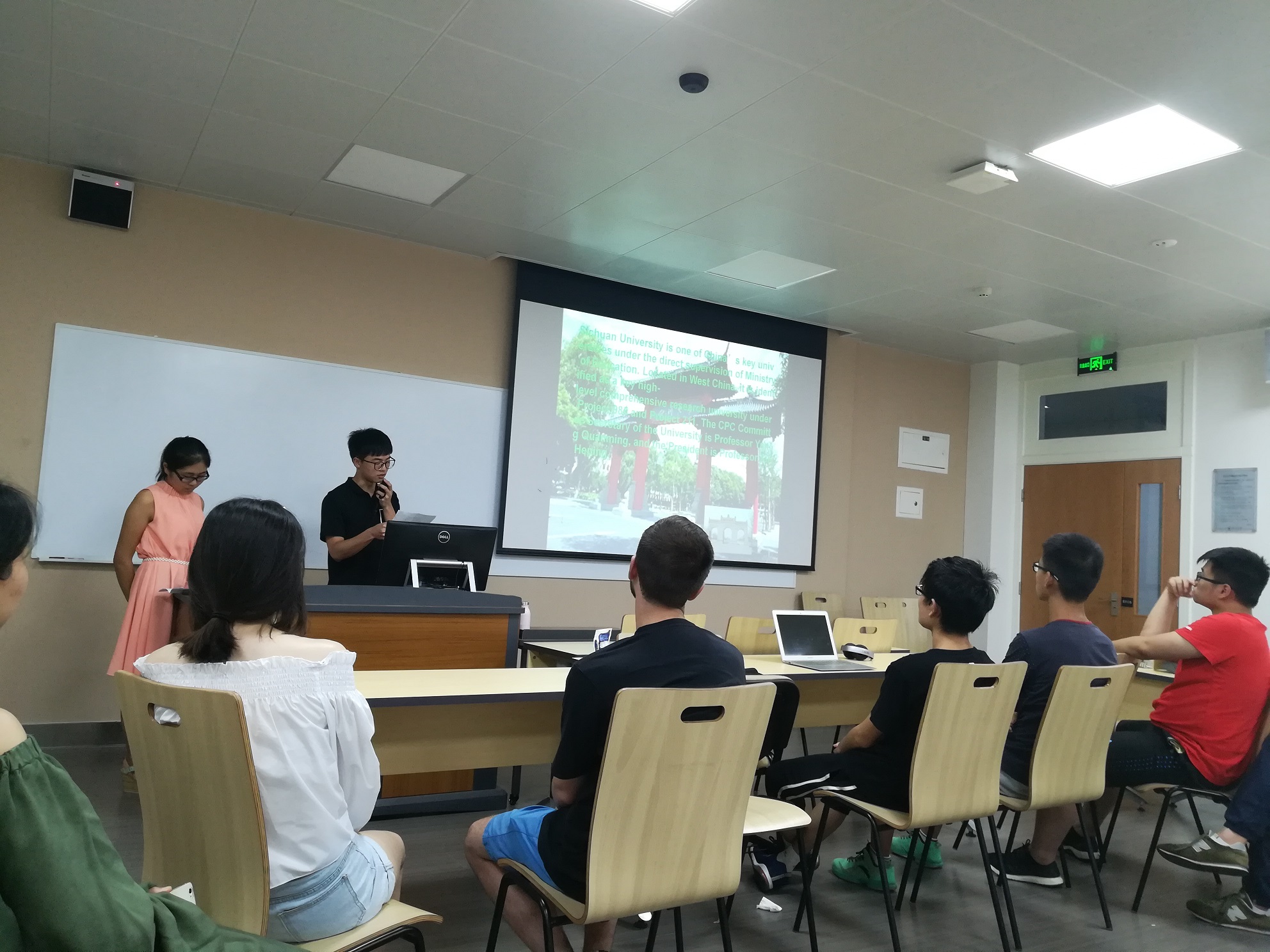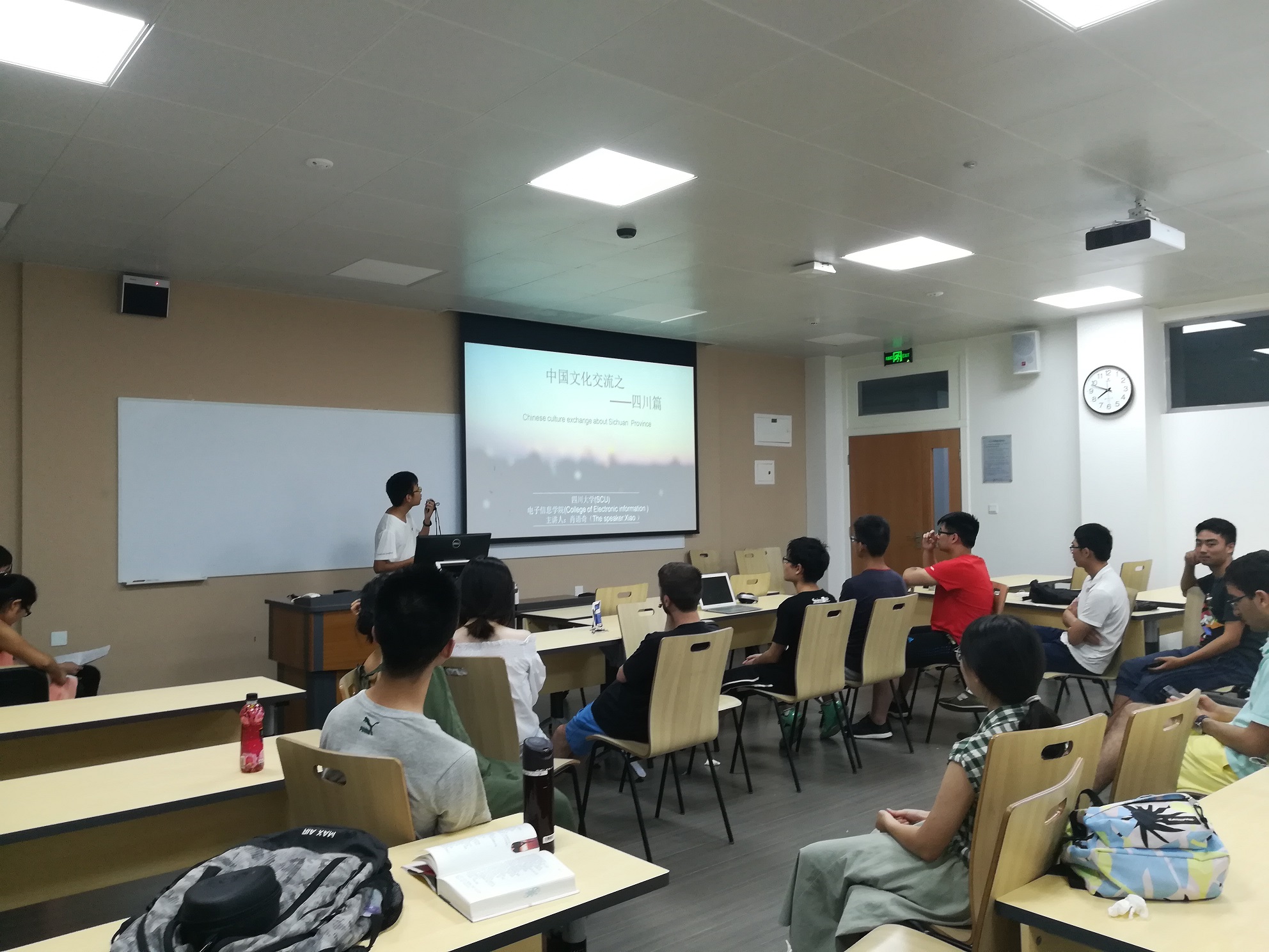交流会于下七点在k1体育江安校区第一基础教学楼A109正式开始,由k1体育十年品牌刘姝廷同学担任此次活动主持人。会前为活跃气氛,同学们围坐在教室中央一起玩了一个报数的小游戏,在一片欢声笑语中,交流会拉开了序幕。首先由k1体育电子信息的肖语奇同学为大家介绍巴蜀文化,美味的川菜、可爱的国宝大熊猫、精彩绝伦的川剧、诙谐幽默的四川方言,无一不引起大家对多彩四川文化兴趣;接下来由k1体育十年品牌员工徐佳朗同学为大家介绍了k1体育的历史,加深了同学们对川大120周年历史的了解;最后,王洁同学从川大美景、美食、建筑三个方面,向大家展示了川大的秀美风光、一流的教学设施以及川大学子丰富多彩的校园生活。交流会后,为增进中外同学友谊以及川大学子与外校员工间的友谊,大家围坐在一起玩了小游戏,在依依不舍之中,第一次文化交流活动正式结束。