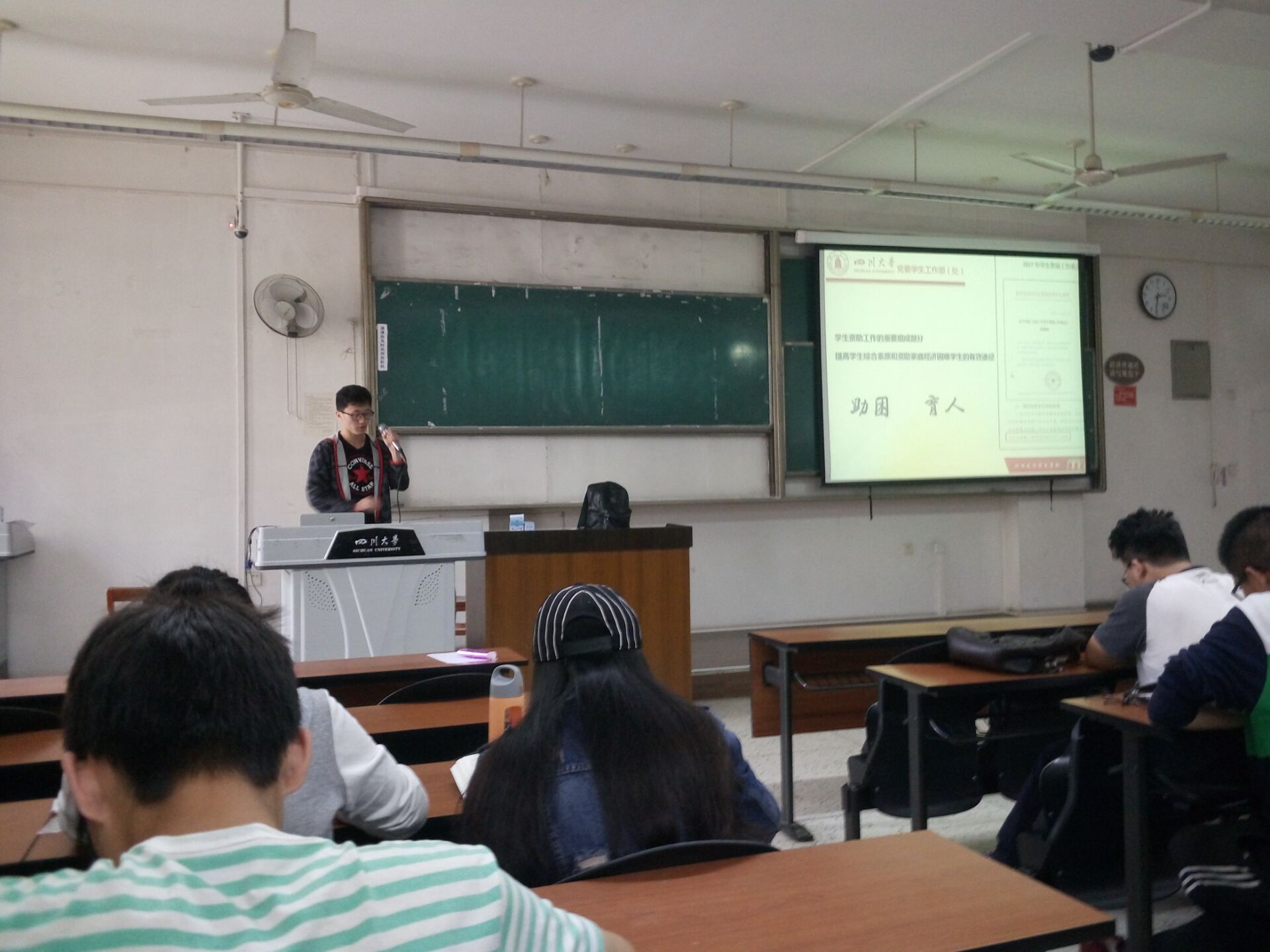 4月28日下午2点30分,2015级在江安一教B101开展“诚信资助”为主题的宣讲活动。阳光资助宣传员张嘉伦为同学们讲解。讲解分为四个部分:1.勤工助学的诚信问题;2.奖助学金评定中的诚信问题;3.老员工以及社会中的征信问题;4.调查问卷的填写与收取。