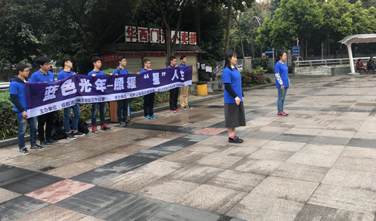 9点20分,志愿者们抵达华西医院门诊楼。在与安保人员协商过后,志愿者们开始了这次蓝色公益体验活动。首先,青年志愿者中的手语组上前开始为来来往往的群众们表演手语节目,精彩绝伦的表演赢得了不少过路人的喝彩。然后,志愿者们,展开了手中的横幅,大声地喊出了“蓝色光年,照耀星人生”的口号。同时,志愿者为过往的路人分发传单,同时采访路人,了解他们心中对自闭症儿童这一群体有何看法有何了解,并为他们系上象征意义十足的蓝丝带。活动最后,全体志愿者合影留念,以纪念此次公益活动。10点钟,志愿者们收拾好物资与场地,坐上了归途的校车。