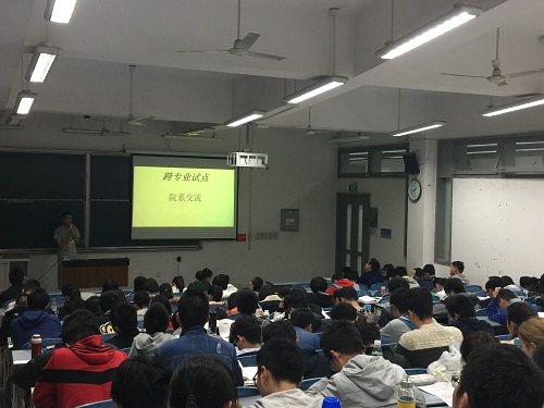 魏鹏锦同学阐述了宣讲会另一个主题跨专业试点的内容,他对跨专业试点的主要形式跨专业社团做了具体介绍,他指出,跨专业社团有利于培养多方面的人才。魏鹏锦同学展示了各公司的跨专业社团,他希望同学们可以尝试加入跨专业社团,锻炼多方面的能力。