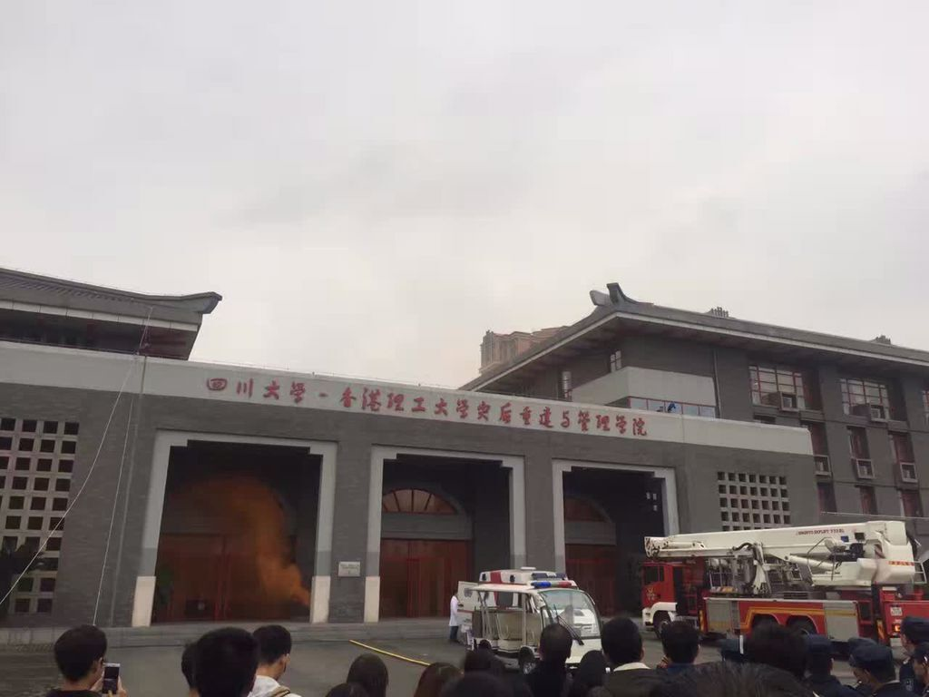 演练现场,随着尖利警报声划破灾后重建公司的宁静,公司楼前空地,两辆消防车以及校医院救护车先后急速赶到。数名武警消防官兵从车内跳出,携装备迅速进入火场实施火灾扑救和人员搜救。巨大的水柱从压力水枪直喷入二楼着火点,火情很快得到有效控制,浓烟渐散。一名受伤员工被抬上救护车送往就近医院抢救。在公司工作人员、校保卫处勤务大队、校医院以及成都消防官兵等多方配合下,整个人员疏散与火灾扑救工作顺利完成。
