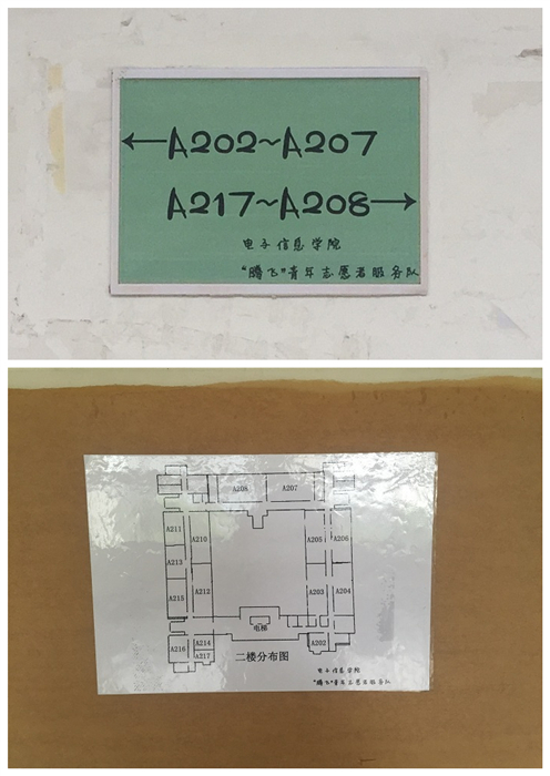 下午14时50分,志愿者们在第二基础实验楼集合,并征得了第二基础实验楼管理人员对本次活动同意与支持。下午15时,志愿者们拿出前期打印好的各楼层分布图和指示牌进行任务分工。随后,志愿者们依次从一楼到四楼在每个楼层的两个电梯中间的告示板粘贴楼层教室分布图,并在转角处粘贴醒目的路标。部分志愿者进行活动拍照以便活动后期的线上宣传。15时40分左右,活动结束,志愿者们整理剩余物资,对活动现场进行清扫,维持了楼道的干净清洁。