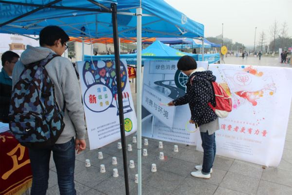 活动中,工作人员利用课间和放学期间的时间,向经过青春广场的同学们发放维权知识宣传单,普及维权知识并邀请同学们参加游戏。参与者需要回答从题库中随机抽取的相关维权问题,并根据答对的题数获取套圈,套中纸杯者可获得杯中字条标明的相应奖品。由于奖品的丰富和游戏的趣味性,活动的参与度较高,同学们在现场玩得不亦乐乎,同时也收获了维权知识,巩固了维权意识。在摊位旁,工作人员还将整幅国际消费者权益日维权宣传海报分割成近100份,由参与活动的同学们根据海报背后的数字,并对应白板上的位置共同贴制完成了这份“万人”海报。3月16日下午18:00,此次四院联合315维权周活动圆满结束。