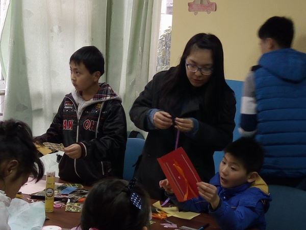 16时,活动正式开始。在给青少年们展示本次活动所需材料时,青少年们都十分兴奋,迫不及待想动手制作一张属于自己的贺卡。志愿者在为青少年们讲解了可用作装饰的星星和花朵的折法后,将材料分发给了青少年们。虽然青少年们热情高涨,但一开始他们仍有些无措,不知道该如何将贺卡做的独一无二。在志愿者们的帮助和建议下,渐渐地,青少年们开发自己的思维,大胆着手开始制作。在遇到困难时,青少年们还相互帮助,更有青少年向志愿者询问“圣诞快乐”四个字的写法,想将这亲手制作的祝福送给爸爸妈妈。
