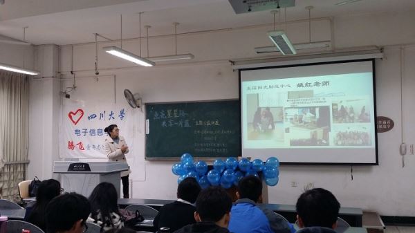 在影展进行的同时,摊位上,志愿者们还放置了一定数量的蓝丝带以供路人书写祝福的话语,然后粘贴到活动海报上,拼成了一颗蓝色的星星。丝带的数量一天天增多,祝福的话语也承载了众人的心意。最后,在11日下午14时,麦田阳光的姚老师走进校园举办了“走进同一片蓝天”的专业讲座,讲述关于自闭症的一些内容。