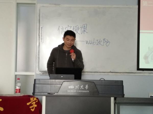 当日上午10点,在易楠同学的主持下,授课正式开始。本次授课采用传统的图文结合的PPT讲课模式,主要介绍了web攻防的入门知识。易楠同学首先向大家介绍web攻防的基本思路,让同学们对此有一个基本的概念和认识。接着又向同学们介绍关于渗透测试的基本知识,由于大家都还没有任何的经验,所以在这一块并没有过多地展开。在基础知识介绍结束后,便是具体攻防招数的讲解,由此易楠同学分别向同学们介绍了代码层面,web服务器层面以及系统服务器层面的具体攻防招数,讲解生动有趣,引起同学们极大的兴趣,纷纷要求易楠同学用讲述的方法进行具体的操作。于是易楠同学现场对一个网站开始进行渗透测试,测试结果表明此网站存在着大量的漏洞,令同学们大开眼界。授课活动的最后,许多意犹未尽的同学继续找易楠同学进行相关的讨论,并提出了自己的问题,并得到了满意的答案。