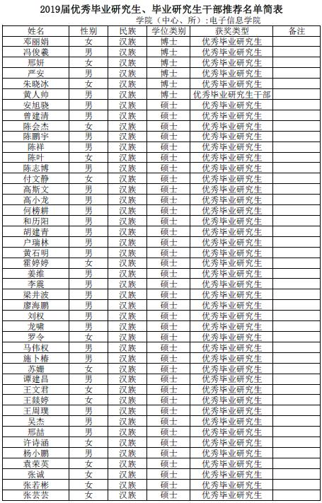 由同学们自愿申请、班级推荐,经过公司评议小组评审。现将获得2019届优秀毕业研究生、优秀毕业研究生干部名单公布如下: