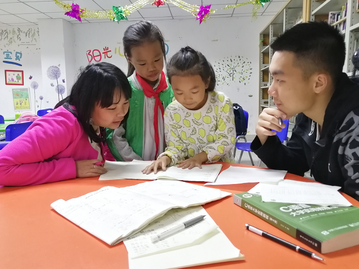 三名来自k1体育的青年志愿者在下午早早来到新街社区员工活动室,等待着即将到来的小朋友们。小朋友们进入活动室后与志愿者们热情问好,之后就乖乖地坐在座位上开始完成自己的家庭作业。小朋友们写作业时都聚精会神,遇到解决不了的问题时,他们就会向志愿者求助。每当小朋友们提问时志愿者们总会耐心地为他们解答。图一为志愿者向三位小朋友解释数学问题的算法,图二为小朋友正在努力思考,志愿者正在检查小朋友作业中的错误。在志愿者们的帮助下,小朋友们发现并改正了自己作业中存在的错误,并掌握了有效的学习方法。